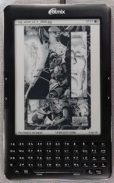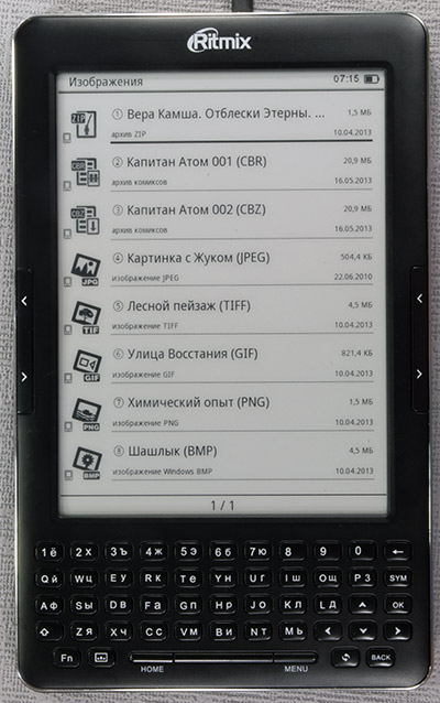 С отображением картинок и фотографий Rutmix справляется весьма успешно: читает все заявленные форматы, а также позволяет просматривать комиксы в формате CBR (а вот формат CBZ отчего-то понимать отказался). Функции предпросмотра картинок в RBK-750 нет, поэтому для поиска нужного кадра среди большого числа снимков придется запоминать его название или листать все кадры подряд.