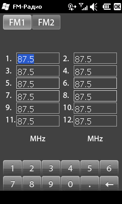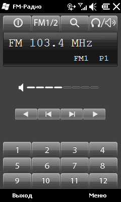 Гарнитура играет роль антенны для встроенного радиоприемника. Отрадно, что все больше коммуникаторов оснащаются этим простейшим модулем. Прием сигнала ведется в популярном FM диапазоне. Программа управления позволяет задать частоту нужной радиостанции, сохранить ее в одну из 12 ячеек, изменить громкость звука (штатные средства ОС и клавиши на нее не влияют). Также можно осуществить быстрый поиск каналов. Качество приема, как и в случае с другими аппаратами, среднее, и сильно зависит от наводок многочисленных модулей связи и компонентов коммуникатора. Лучше всего приемник ловит сигнал в городе в непосредственной близости от источника.