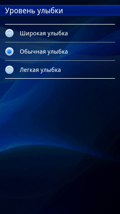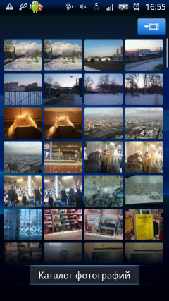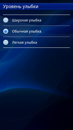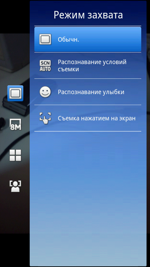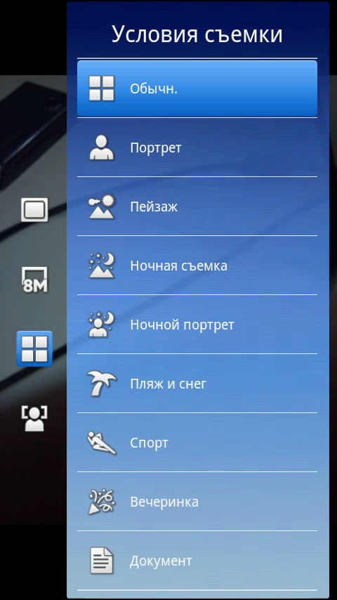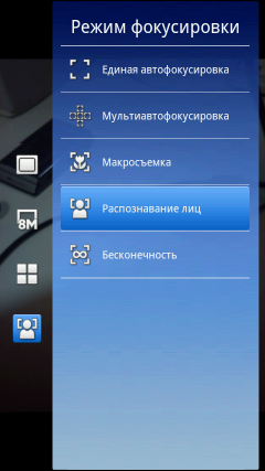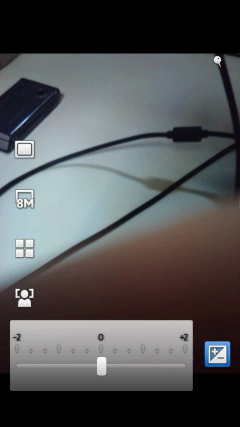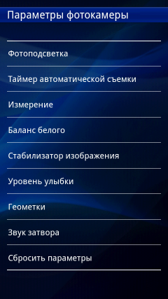 Интерфейс программы управления камерой не перегружен значками и иконками, на нем расположены только самые необходимые из них: переключение режима съемки фото/видео, информация о свободной памяти, режим захвата (обычный, распознавание условий съемки, распознавание улыбки, съемка нажатием на экран), разрешение съемки, условия съемки (пейзаж, портрет, ночная съемка и так далее), режим фокусировки (единый, множественная, макросъемка, бесконечность). В нижней части экрана находится кнопка коррекции экспозиции, а также эскизы последних четырех снимков с иконкой фотоальбома. Все эти значки могут быть убраны с экрана для более удобной съемки. Дополнительные параметры съемки и настройки камеры находятся в отдельном меню. Например, там можно включить функцию стабилизации съемки с рук, подключения навигационных координат к снимкам или настроить баланс белого.