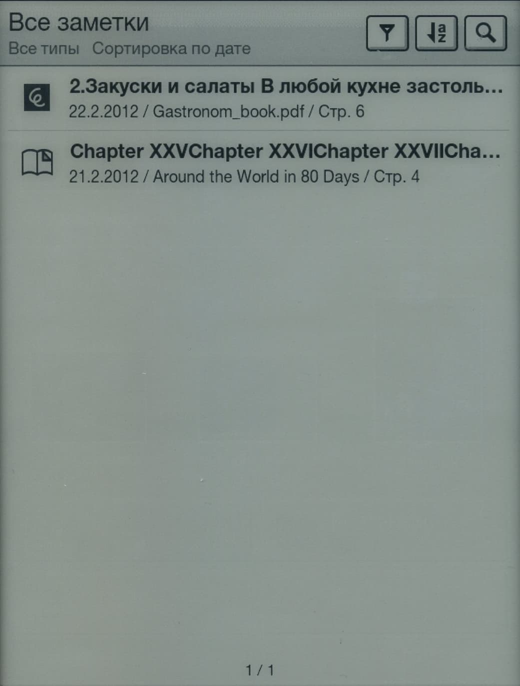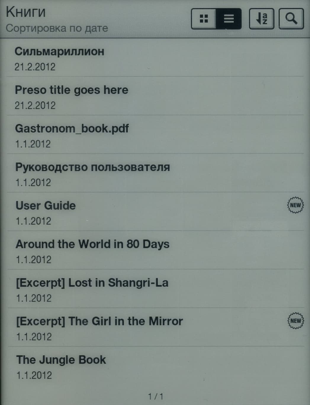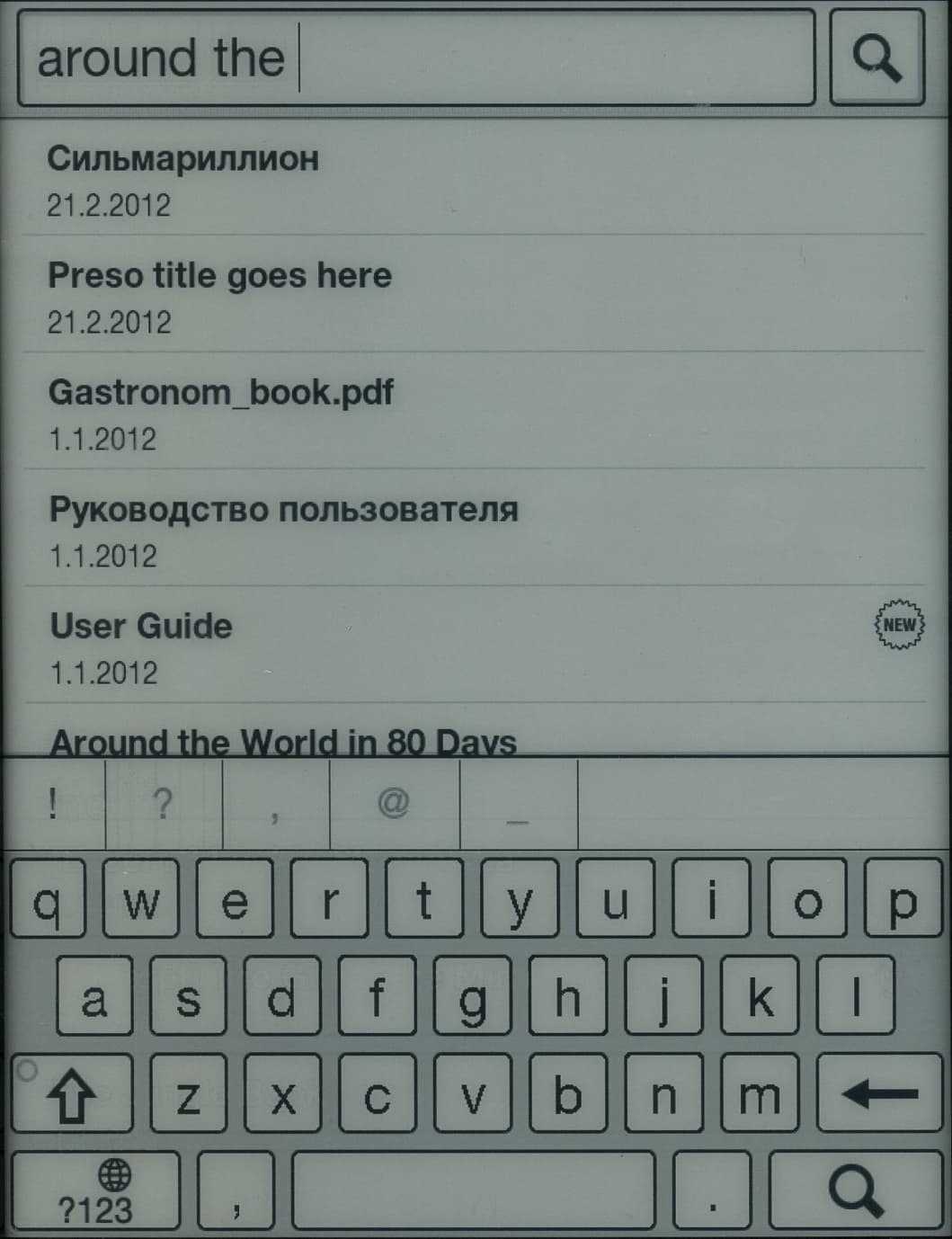 В самом разделе «Книги» возможен поиск или разнообразная сортировка по дате, названию, автору и самому файлу. Для переключения языка раскладки виртуальной клавиатуры при поиске следует подольше подержать нижнюю слева функциональную клавишу с изображением глобуса, иначе буквенная раскладка будет просто меняться на цифровую. Поиск по первым буквам здесь реализован, однако он не автоматизирован: нужно сначала набрать несколько первых букв и затем нажать клавишу поиска — автоматической подстановки искомых вариантов в режиме реального времени здесь нет. Набери хоть все название целиком — ридер будет ждать нажатия на «Поиск».