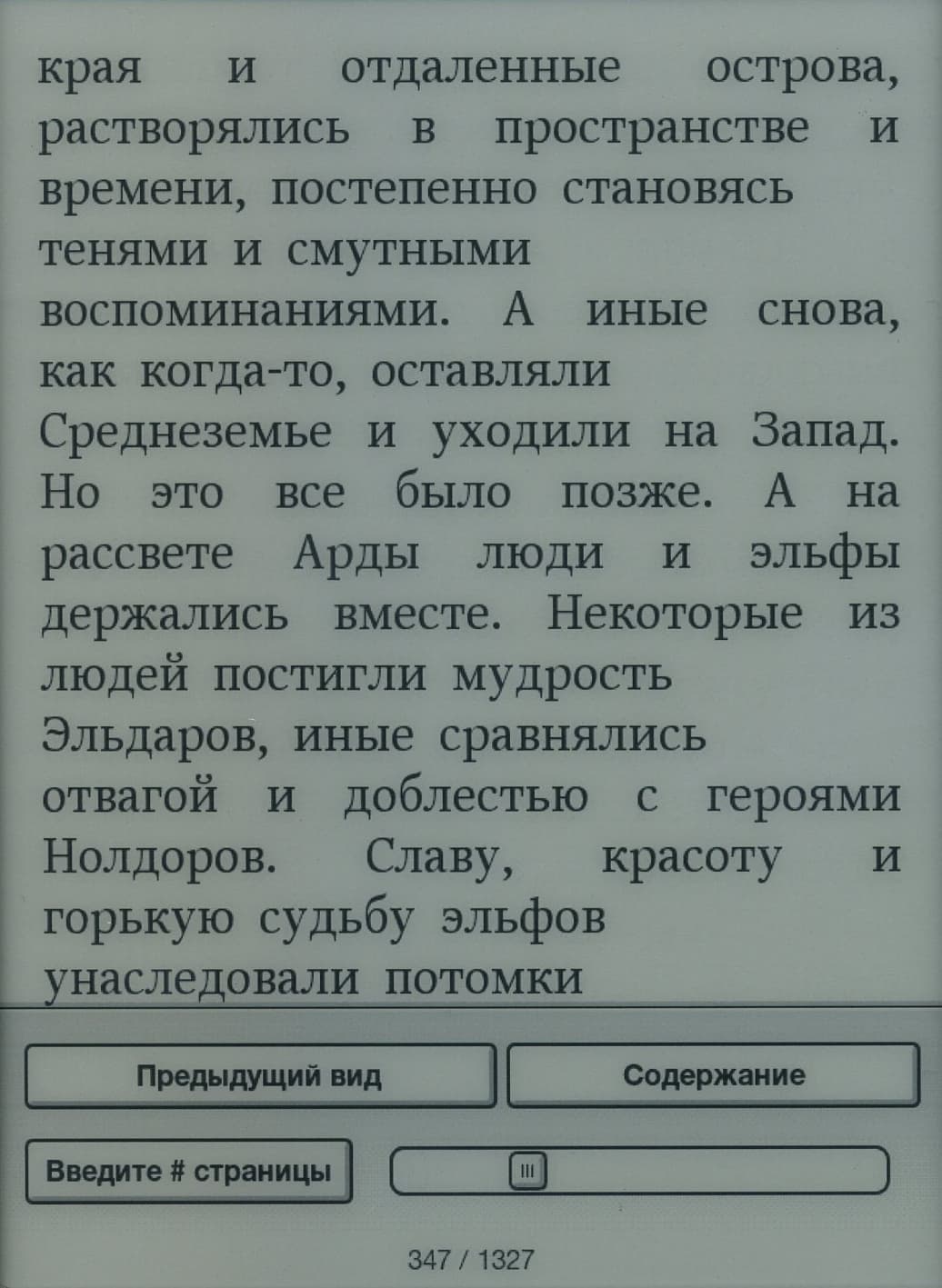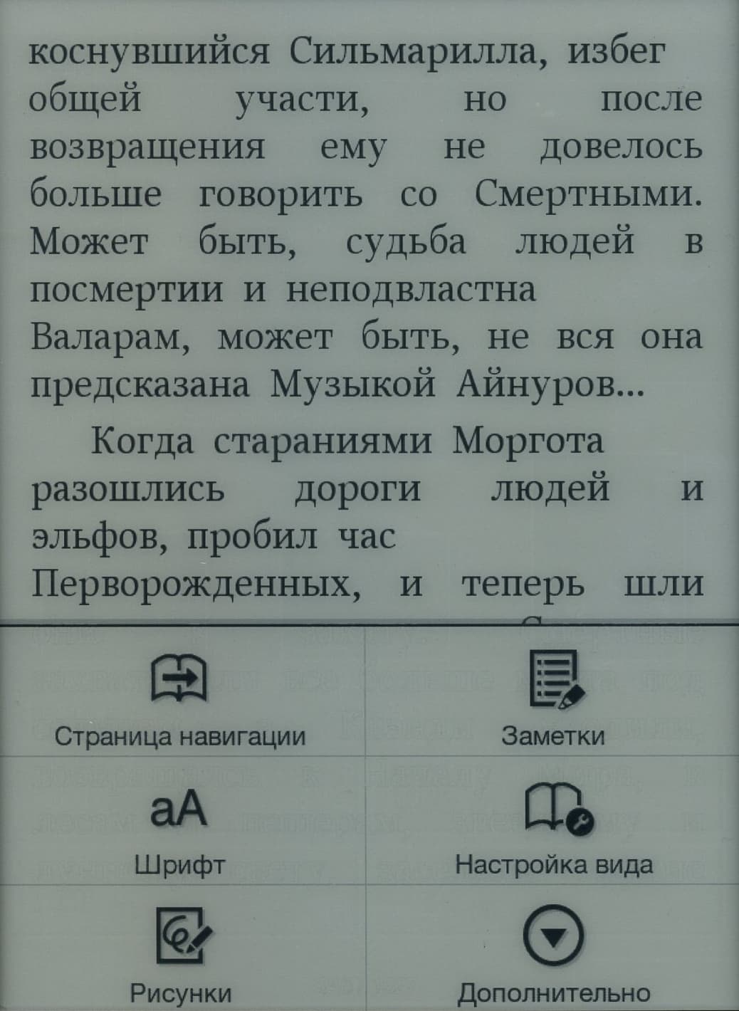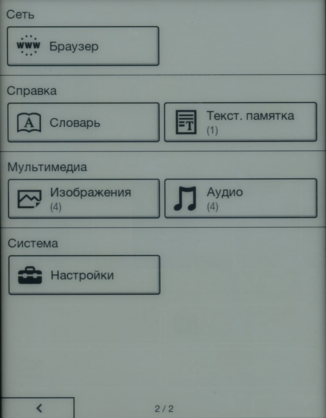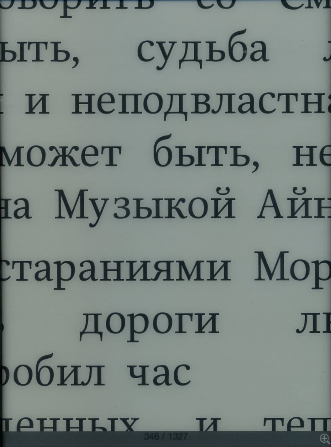 Во время чтения страницы можно перелистывать как нажатием кнопок «Вправо»/«Влево» (это особенно удобно левше, так как кнопки оказываются ровно под большим пальцем), так и простым горизонтальным движением пальца по экрану. Боковых клавиш для перелистывания здесь, к сожалению, нет — а ведь они так бывают удобны при вертикальном расположении книжки. Правда, при такой минимизации размеров корпуса и рамки вокруг экрана, сомневаюсь, что была бы возможность их тут разместить.