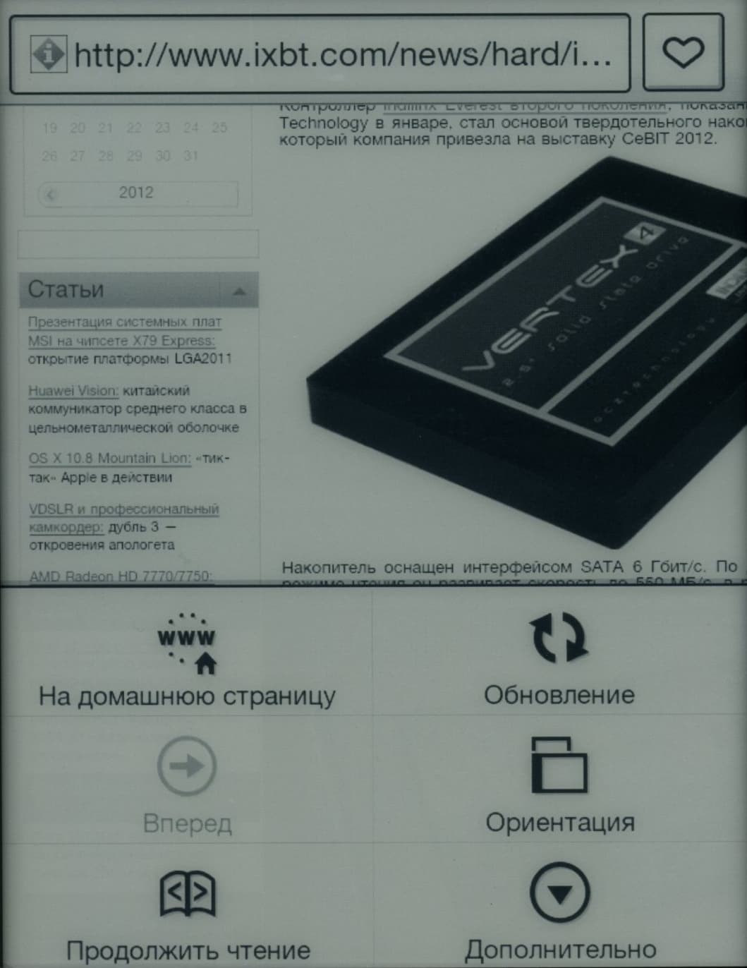 В нашу тестовую лабораторию электронная книжка попала в ритейл-упаковке, хотя первые партии отличаются от последующих тем, что здесь пользователю самому предлагается обновить прошивку для достижения оптимального результата. Таким результатом для нашего читателя является, конечно же, добавление возможности чтения FB2 — самого популярного в нашей стране формата для чтения с электронных устройств. На упаковке четко указано, что требуется обновление ПО. До обновления ридер способен читать лишь три формата: PDF, ePub (как с DRM, так и без) и TXT. Это безусловный минус данного устройства, ведь если, скажем, офисное приложение для работы с таблицами Excel здесь не слишком востребовано, то уж открыть документ в формате RTF или DOC любой уважающий себя наладонник сейчас просто обязан.