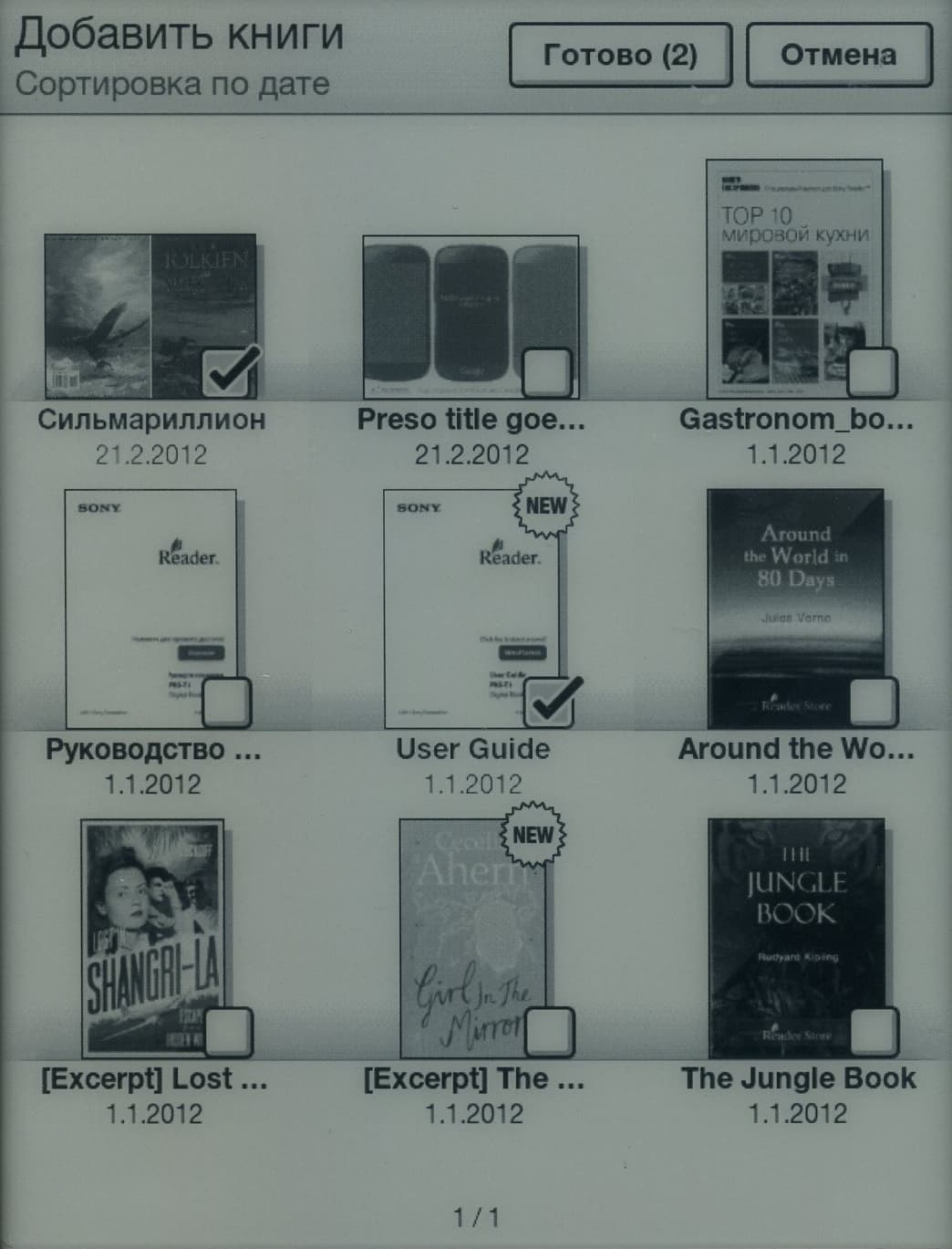 Следом идет горизонтальный список из последних добавленных в память ридера книг, также состоящий из мини-обложек и текстовых подписей. Наличие данного списка кажется нелепым в русской версии ридера, лишенной возможности покупки или аренды книг в виртуальных онлайн-библиотеках. Однако такая информация о последних добавленных книгах становится более чем актуальной, если чтиво арендуется на время.
