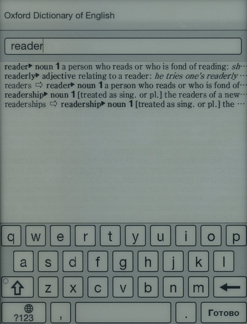 Есть еще одна полезная, казалось бы, возможность сенсорной работы с текстом: если нажать на любое слово и подержать, то поверх текста появится меню, предлагающее найти это слово во встроенных словарях или онлайновых поисковых системах. Но тут оказывается, что оксфордские встроенные словари ничего «не имеют сказать» по поводу значения русских слов, а после нахождения искомого слова в мобильной википедии или гугле, назад к чтению уже не вернуться — вы в браузере. Приходится закрывать его, перемещаться на главную страницу и оттуда снова открывать читаемую книгу. Это очень неудобно и отбивает всякую охоту в следующий раз заниматься таким поиском.