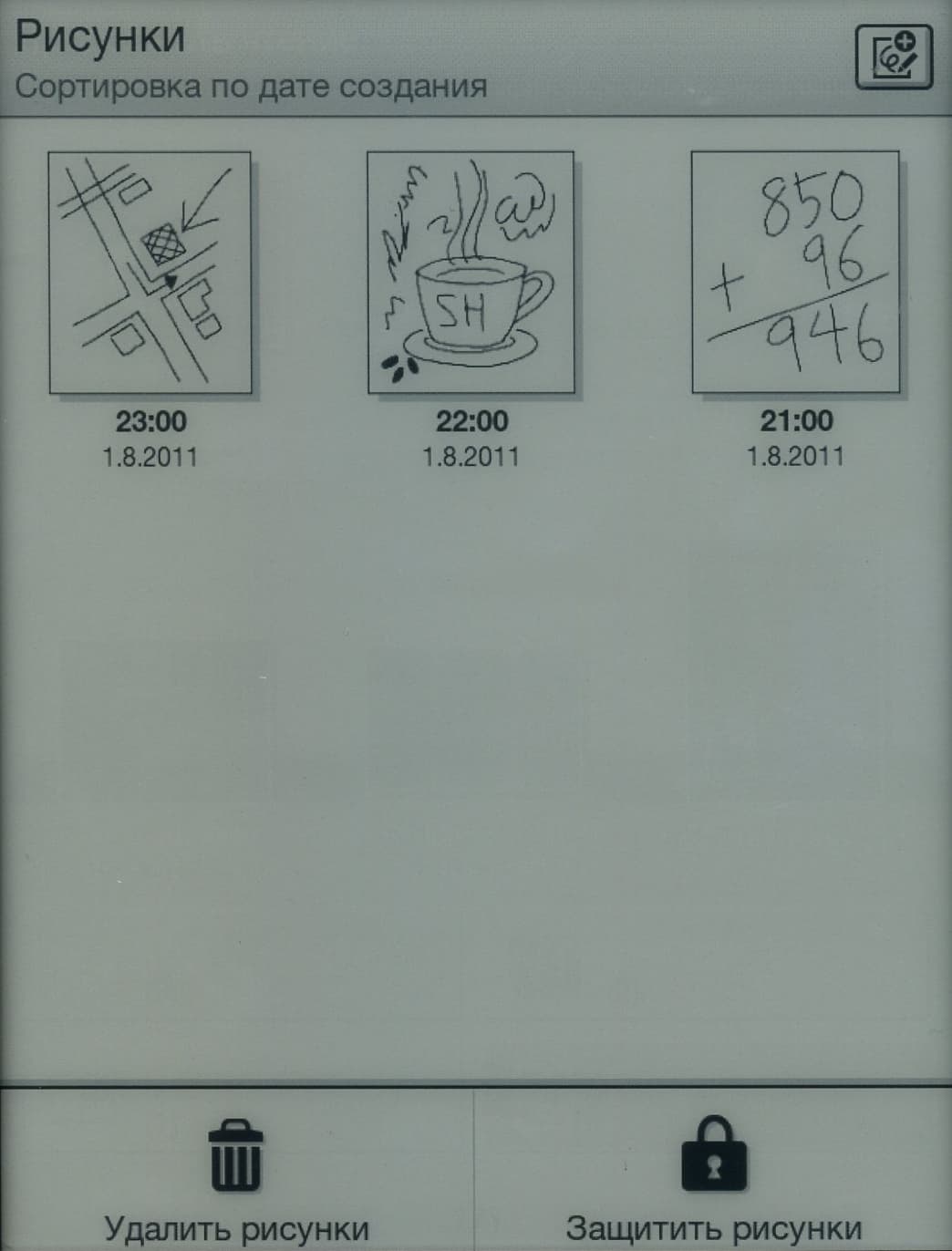 Раздел «Заметки» содержит как закладки, так и собственноручно нанесенные пометки поверх текста, либо собственные рисунки. Впрочем, для непосредственно рисунков здесь имеется и отдельный раздел. Само название раздела — «Заметки» — слегка сбивает с толку, особенно при обращении к нему из режима чтения. Ведь основное содержимое его — это все-таки именно закладки. Наверное, лучше было бы его так и назвать.
