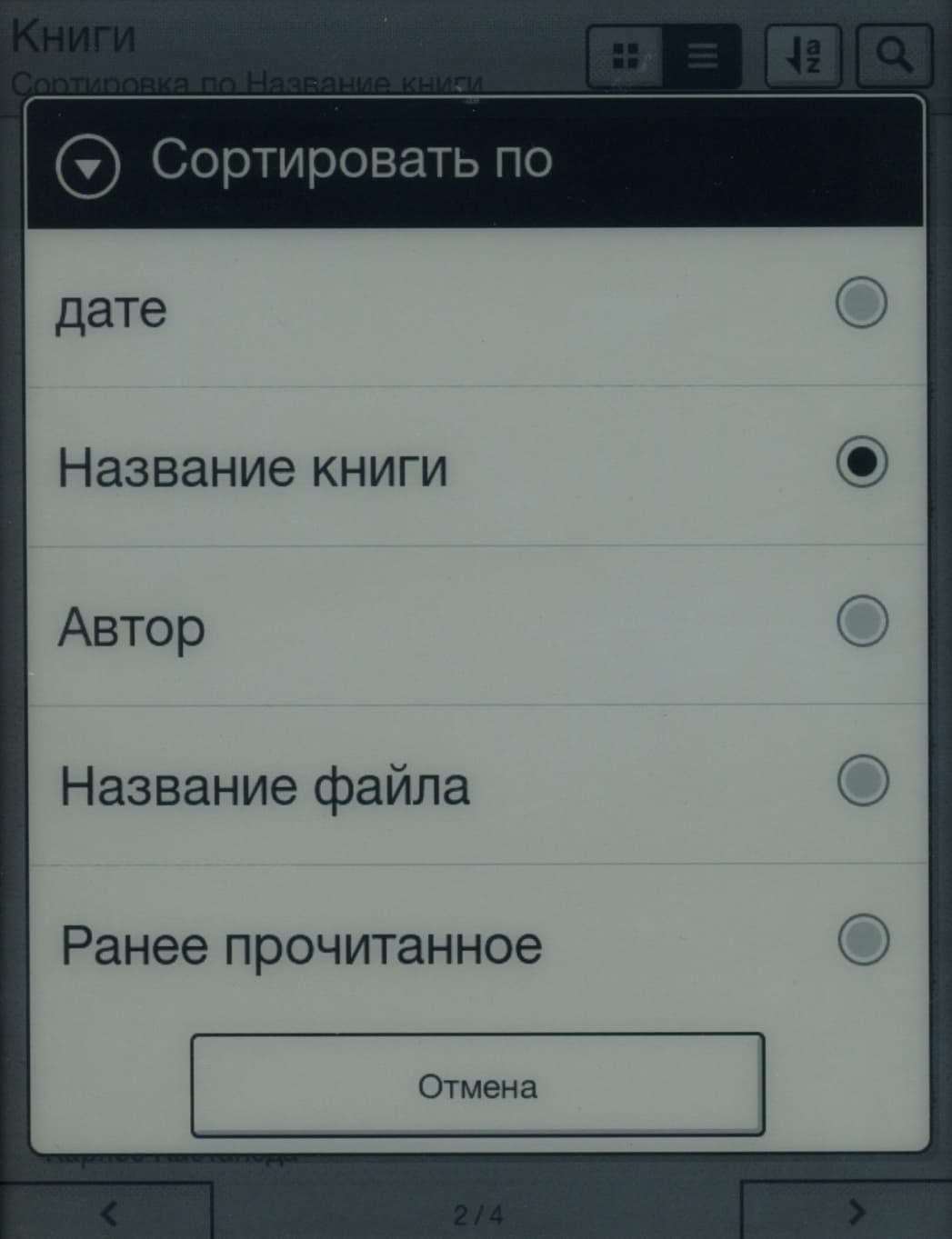 Раздел «Книги» может быть представлен как вертикальным списком, так и «плиткой» из мини-обложек всех находящихся в памяти ридера книг. Именно так: все книги, попавшие на карту памяти или непосредственно в память устройства, появляются в этом списке независимо от количества внутренних папок, строение которых, оно не понимает. Так что нет никакого смысла строить папочную иерархию, а следует воспользоваться инструментом под названием «Коллекции».