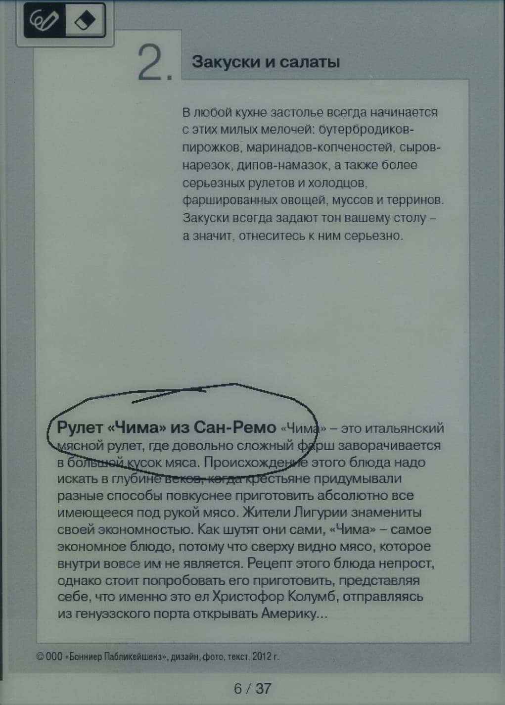 Во время чтения вовсю используются возможности сенсорного экрана. Например, нажав и подержав правый верхний уголок экрана, можно создать закладку с собственными пометками или даже рисунками. Это напоминает «заметки на полях» обычных бумажных книг. При этом уголок остается отогнутым, сигнализируя о том, что на этой странице имеются пометки. Если на уголок нажать быстро, то закладка сотрется.