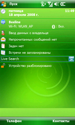 Коммуникатор работает под управлением операционной системы Windows Mobile 6 Professional. На главном экране системы никаких дополнительных индикаторов или приложений нет. Все добавочные утилиты собраны в меню программ операционной системы и запускаются по требованию. Это способствует уменьшению расхода как оперативной, так и постоянной памяти. Все необходимое программное обеспечение пользователь сможет запустить (или добавить) самостоятельно. К примеру, в ПЗУ записана Opera — мобильная версия одного из лучших интернет браузеров.