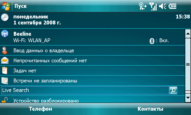 Экран G910 полностью аналогичен примененному в G900. Разрешение и размеры матрицы необычны для семейства WinMobile устройств — 800 х 480 пикселей, 3 дюйма, соответственно. Несмотря на приличную диагональ, дисплей кажется небольшим. Повинны в этом вытянутость по ширине и габаритные размеры корпуса. Работать уверенно с коммуникатором можно только двумя руками. В ином случае, есть шансы его выронить, а пользоваться одновременно клавиатурой и стилусом крайне затруднительно. Качество дисплея отличное , высокое разрешение позволяет уместить на нем больше полезной информации. По умолчанию ориентация экрана установлена альбомной, что затрудняет работу со многими приложениями и заставляет часто прокручивать страницы и окна. Огорчает, что уровней подсветки всего четыре, и она не отключается полностью.
