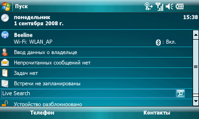 Коммуникатор позволяет работать с VoIP через сети Wi-Fi, но собственного клиента Интернет-телефонии не установлено. Поддержка Wi-Fi реализована средствами операционной системы, процесс управляется стандартными утилитами. Модуль Bluetooth версии 2.0 поддерживает технологию EDR и передачу стереозвука, программная часть технологии представлена стеком Microsoft. Работа модулей связи не вызвала серьезных нареканий, все драйверы и программы проверены годами использования в устройствах WinMobile, а действия по их настройке просты и понятны.