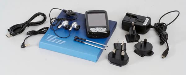 Внутри коробки находился коммуникатор, оклеенный защитной пленкой. Для аксессуаров предназначались несколько отдельных коробочек. В одной из них было упаковано зарядное устройство в комплекте с несколькими адаптерами, под различные типы розеток. Запасной стилус, аккумулятор, гарнитура и кабель синхронизации (USB – miniUSB) находились в другой коробке. Увесистый мануал на нескольких языках, гарантийное обязательство и диск с ПО расположились в третьей.