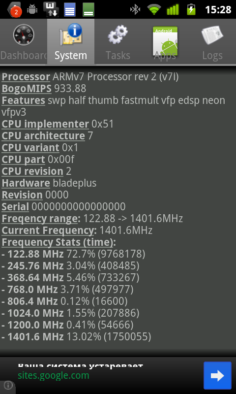 С основным параметром коммуникатора — частотой процессора, получилось недоразумение. Разные источники дают различную информацию, ситуацию усугубляет отсутствие какой-либо информации о коммуникаторе на сайте производителя. По одним данным, в ZTE Blade+ установлен процессор Qualcomm MSM 8255 с частотой работы вычислительного ядра 1 ГГц, по другим данным — 1,4 ГГц. Тесты производительности и утилиты мониторинга работы процессора подтверждают последнюю величину.