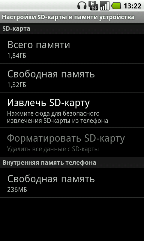 - оперативная память 512 МБ, флеш-память 512 МБ (доступно 236 МБ), карта microSD 2 ГБ;