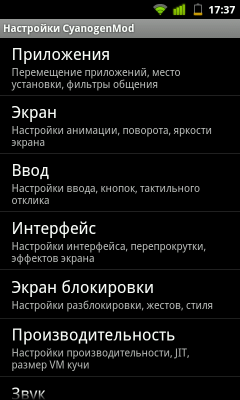 Настройки CyanogenMod находятся в стандартном меню настроек системы. Они разделены на несколько подпунктов. Первый из них, Приложения, позволяет указать, где хранить приложения: во внутренней памяти коммуникатора или на карте microSD — и перемещать их при необходимости. Там же находятся настройки забавного, но в некоторых случаях необходимого «Пьяного режима» работы коммуникатора. С его помощью можно задать фильтр исходящих звонков и коротких сообщений, когда устройство будет тестировать «вменяемость» владельца, задавая ему математические задачи или просто предупреждая о необходимости дважды подумать перед звонком или отправкой сообщения в неурочный час.