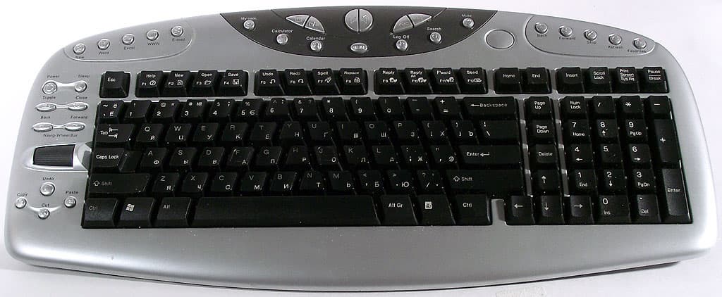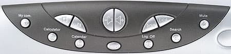 Центральный блок включает в себя 13 кнопок, предназначенных для управления мультимедиа-функциями, а также общего управления компьютером. Три кнопки управляют громкостью (две центральных меняют ее уровень, третья, расположенная в сторонке, выполняет функцию Mute), еще четыре предназначены для использования в плеерах (Play/Pause, Stop, FF, Rew), нашлось место и для кнопок, позволяющих открыть «Мой компьютер», начать поиск информации, выйти из системы или просто запустить калькулятор или календарь. Последняя кнопка этой группы переключает режим работы функциональных кнопок.
