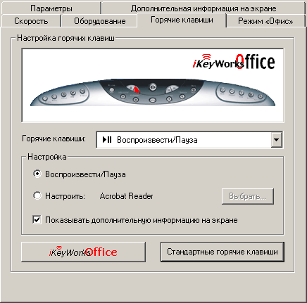 Наиболее важная закладка так и называется — Дополнительные клавиши она позволяет настроить 23 верхних кнопки. Если вы перемудрите с настройками, всегда можно вернуться к «стандартному» их назначению, нажав всего одну кнопку. В режиме же iKeyWorksOffice они изначально настроены на офисную работу, но, самое главное, могут быть переопределены по желанию пользователя.