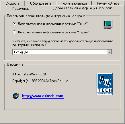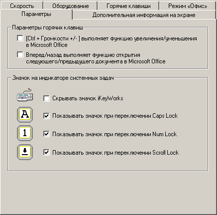 После установки iKeyWorks пользователь получает работу всех кнопок, дополнительные значки в системной области панели задач и четыре дополнительных страницы в стандартном диалоге настройки свойств клавиатуры, одна из которых позволяет управлять как раз значками в трее :) Впрочем, закладка Параметры кроме этих очевидных действий позволяет включить еще две крайне полезных функции: масштабирование и переключение документов в приложениях MS Office. Обе значительно облегчают работу, и позволяют куда реже браться за мышь.