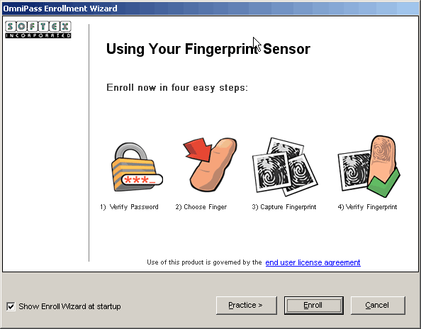 Сразу убираем галочку Show Enroll Wizard at startup, ибо, скорее всего, больше он нам не понадобится (при необходимости можно вызвать специально, кликнув на кнопке Enroll Finger в окне главной программы), и приступаем к регистрации своих немытых лап в системе :)