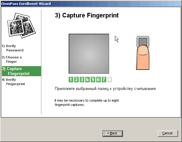 Первое что мы видим после входа — это окно OmniPass Enrollment Wizard — программы отвечающей за регистрацию отпечатков пользователя (первый пользователь OmniPass создается автоматически на основе информации из текущей учетной записи пользователя Windows).