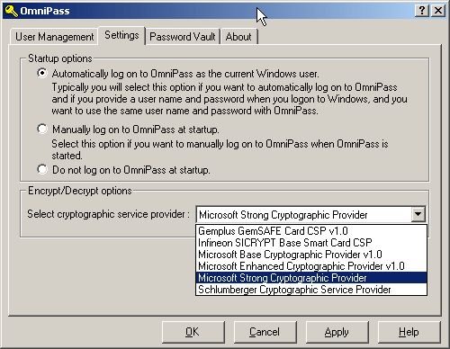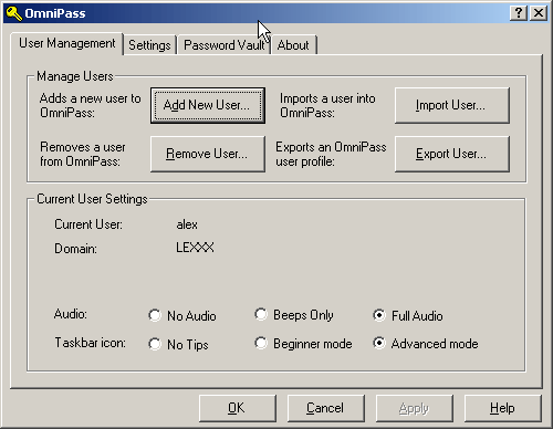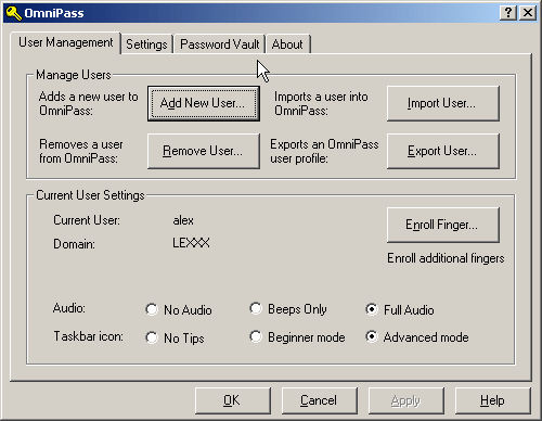 Программой для работы с паролями естественно является OmniPass — менеджер паролей от компании Softex Inc. Это основное приложение для работы с биосенсором, которое и занимается хранением и подстановкой нужных паролей. Версия на диске — 2.0.81, но, установив программу, её тут же можно обновить с сайта компании (через программу Weblink, которая устанавливается вместе с OmniPass). Текущая на момент написания обзора версия — 2.0.91 (на сайте также можно приобрести коммерческую версию 3.5).