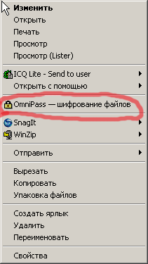 А теперь как обещалось, рассмотрим подробнее вторую главную возможность OmniPass. Процедура шифрования запускается при правом клике на файле или папке и выборе соответствующего пункта меню (см. выше).