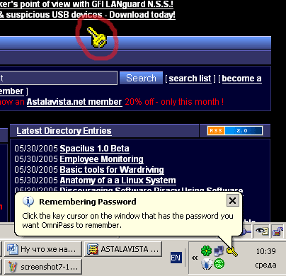 Итак, перейдем непосредственно к истязанию. Вооружаемся OmniPass User Guide, который утверждает, что достаточно загрузить любой сайт с формой «имя/пароль» в браузер, как OmniPass это тут же распознает и выдаст всплывающую подсказку. Если кликнуть по ней, то курсор превратится в ключик.