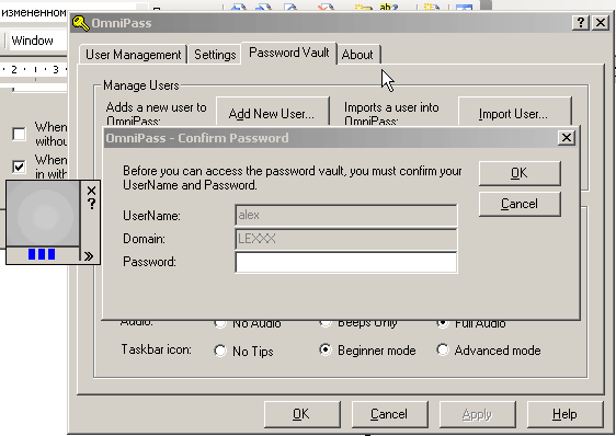 Затем честно выползло окошко, намекающее на то, что неплохо бы установить с прилагающегося диска программу OmniPass для работы с данным устройством. Что я и сделал, после чего система ушла в перезагрузку, а на появившемся после этого экране выбора пользователя я лицезрел дополнительный квадратик рядом с приглашением системы ввести имя пользователя и пароль. Поскольку отпечатков мы пока ещё не зарегистрировали, спокойно «не замечаем» его, жмем ОК и заходим в систему как обычно — такой способ программа тоже допускает (хотя логичнее было бы предположить полную замену пароля входа в систему на отпечаток — и к тому же более безопасно, но такой опции я не нашел).