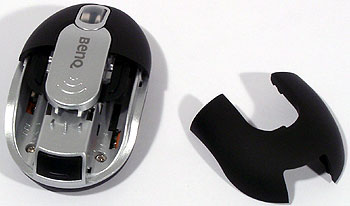 Выше я сказал о давлении на заднюю часть вставки, но можно нажать и на переднюю при этом отщелкнется спинка, что даст нам легкий доступ к батарейному отсеку. Расположен он стандартным для компактных моделей образом, и, должен вам заметить, в продукции конкурентов снятие крышки обычно представляет собой не самую приятную задачу: мышь маленькая, упереться пальцами особо некуда, да еще и скользят они по крышке, поскольку закрепляется последняя достаточно хорошо. Применение специальной кнопки не в пример удобнее, за что дизайнеров BenQ хочется поблагодарить. Пустячок, а сколько нервов способен сэкономить!
