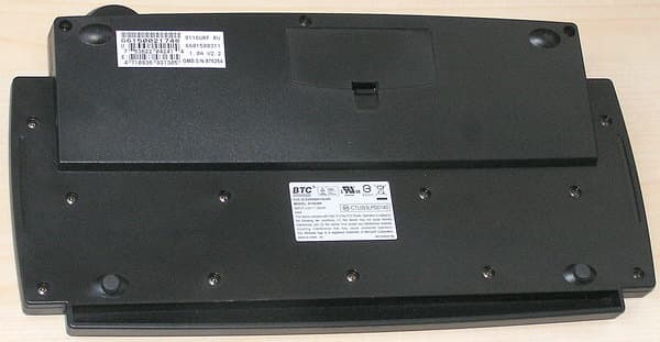 Да и, признаться, держать ее на коленках (придерживая за «ушки») удобнее, чем на столе. (Толщина задней части клавиатуры определяется, видимо, конструкцией джойстика, см. фото.) Две передние ножки — резиновые. Подставка для кистей рук также отсутствует — нет ни встроенной, ни пристегиваемой. Но если учесть, что BTC 9116URF все же наколенный, а не настольный «зверек», то это даже хорошо. Впрочем, что за «подставку» для рук можно с натяжкой принять небольшой выступ спереди, который немного сглаживает «ступеньку», хотя как опора для рук она совершенно непригодна и послужит скорее как еще одно «ушко» при удерживании и переноске клавиатуры.