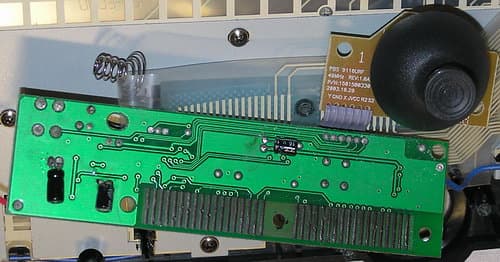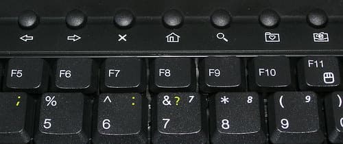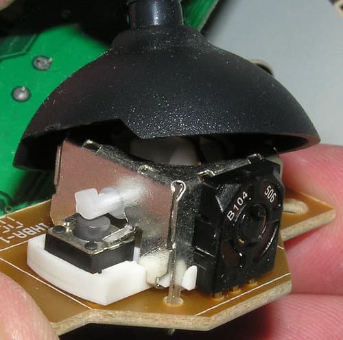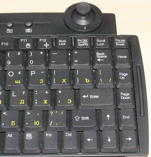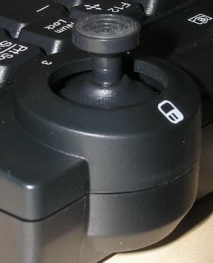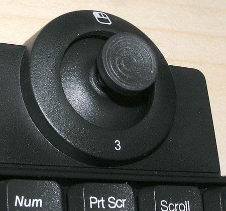 «Палка радости» (буквально с англ.) крутится по кругу, обеспечивая «8 степеней свободы», и нажимается — как левая кнопка мыши. Для облегчения работы на коленках «двумя руками» (о, горе одноруким! :)) две небольшие кнопки, эмулирующие левую и правую кнопки мышки, расположены совсем в другом месте клавиатуры — в левом верхнем углу.