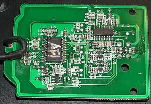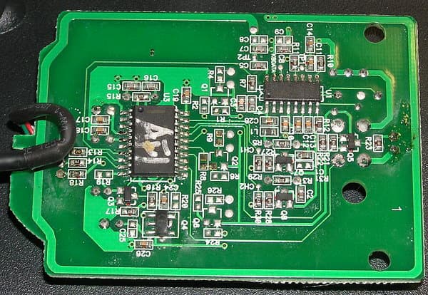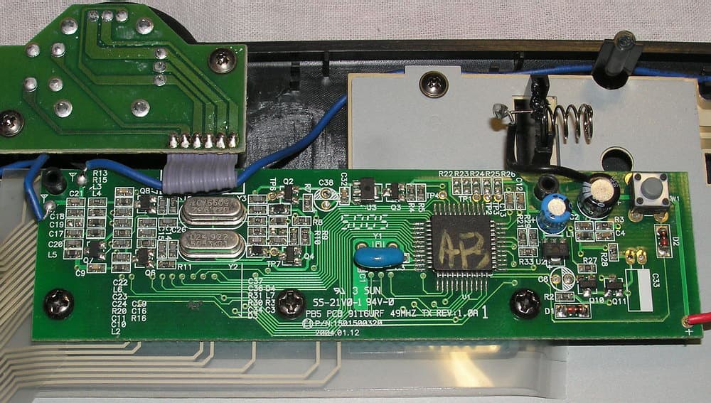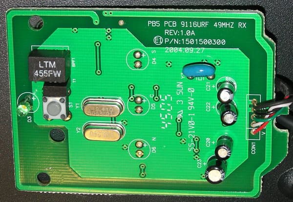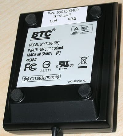 Приемник на стороне ПК представляет собой неприглядную черную (или серую) коробочку средних размеров с прозрачной кнопкой Connect (она же индикатор работы) и резиновыми ножками. Он подключается к USB-порту ПК проводом длиной примерно полтора метра (провод служит также для подачи питания и выступает в качестве антенны). Потребление радиоблока от порта USB компьютера не превышает 100 мА. Внутренность приемника — ничем не примечательная плата, датированная 2004 годом. :)