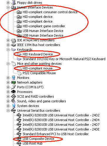 В принципе, клавиатура с эмулятором мыши может работать и без установки этой программы. Во-первых, если в BIOS Setup системной платы выставлена поддержка USB-клавиатуры и USB-мыши через BIOS, то даже в DOS (и POST) BTC 9116URF прекрасно работает и как клавиатура, и как мышь (подходит стандартный досовский драйвер мыши). Правда, при этом может возникнуть проблема с загрузкой Windows XP (которая решается, если для USB-мыши в BIOS Setup поставить поддержку через ОС). А во-вторых, в Windows XP (остальные ОС не проверял) при подключении USB-радиоприемника 9116URF в Device Manager автоматически распознаются и активируются (со стандартными драйверами от Microsoft) несколько HID-устройств (см. скриншот), после чего клавиатура и эмулятор мыши начинают прекрасно работать.