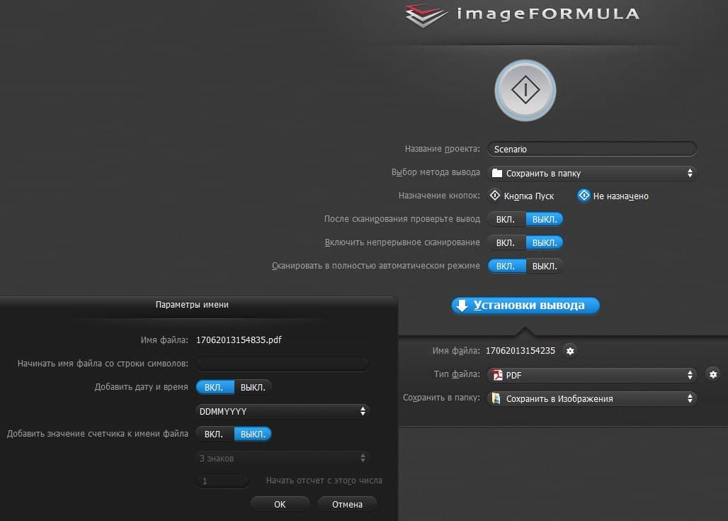 Собственный сценарий сканирования можно гибко настроить: указать формат готового файла (PDF, JPEG, TIFF, PPTX, BMP), настроить алгоритм именования и несколько других опций.