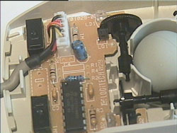 Результаты вскрытия M-CQ38, в первый момент, очень меня удивили. Под удерживаемой тремя винтами крышкой корпуса я обнаружил практически пустую печатную плату: на ней стояли только три микропереключателя IC DM1, разъем интерфейсного кабеля, диски с оптоэлектронными парами и три конденсатора. Озадачило меня отсутствие чипа и других элементов. Но, подняв плату, я обнаружил и чип, и внушительное количество сопротивлений, смонтированных на ее обратной стороне. В дополнение, хочу отметить наличие, внутри корпуса этой мышки, "купола" закрывающего шарик: он предотвращает попадание пыли и грязи в оптическую систему и, тем самым, повышает надежность.