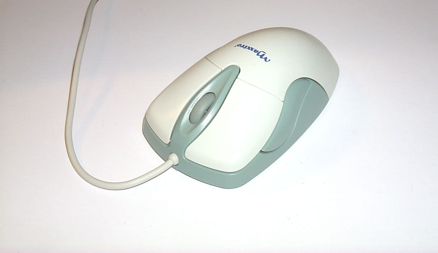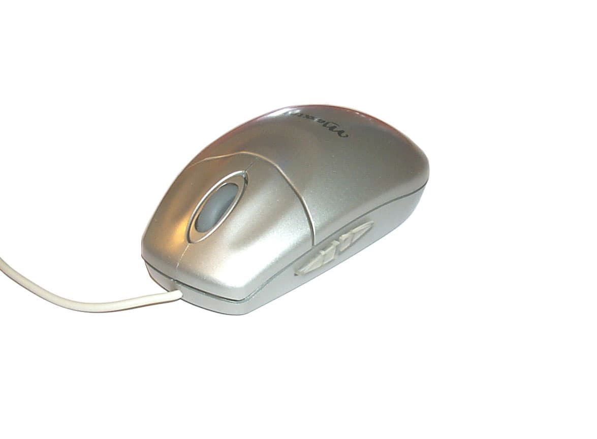 Это — вторая мышка с колесом, но теперь на фоне не такого яркого, но все же весьма приятного вида, нам предстает более широкое функциональное разнообразие. Мышь имеет весьма изящные формы, которые очень удобно подходят для руки, не оставляя ни одну из многочисленных кнопок вне поля взаимодействия и не оставляя ни один из пальцев без работы. Несмотря на изогнутость, абсолютная симметричность дает возможность работать с мышью не только правой, но и левой рукой. Глаз радует приятное цветовое решение окраски поверхности, которое сочетает в себе белый и темно-серый цвета, покрывающие различные части корпуса. Боковые кнопки длиной примерно 5,5 см, достаточно большие, чтобы можно было располагать пальцы как угодно, без четкой фиксации их положения. Основные кнопки к началу расширяются, что позволяет держать пальцы свободно и не сводить их к одной точке. К тому же, к внешним начальным углам основные кнопки слегка изменяют угол наклона, принимая практически горизонтальное положение, что удобно для расположения пальцев и для предотвращения скольжения. Мышь оснащена двумя основными кнопками, колесом, находящимся между ними, и тремя дополнительными программируемыми кнопками — средняя под колесом и по одной на боковых сторонах. Интерфейсный кабель, выходя из мышки, проходит 1.47м своего пути и оканчивается PS/2 разъемом зеленого цвета.