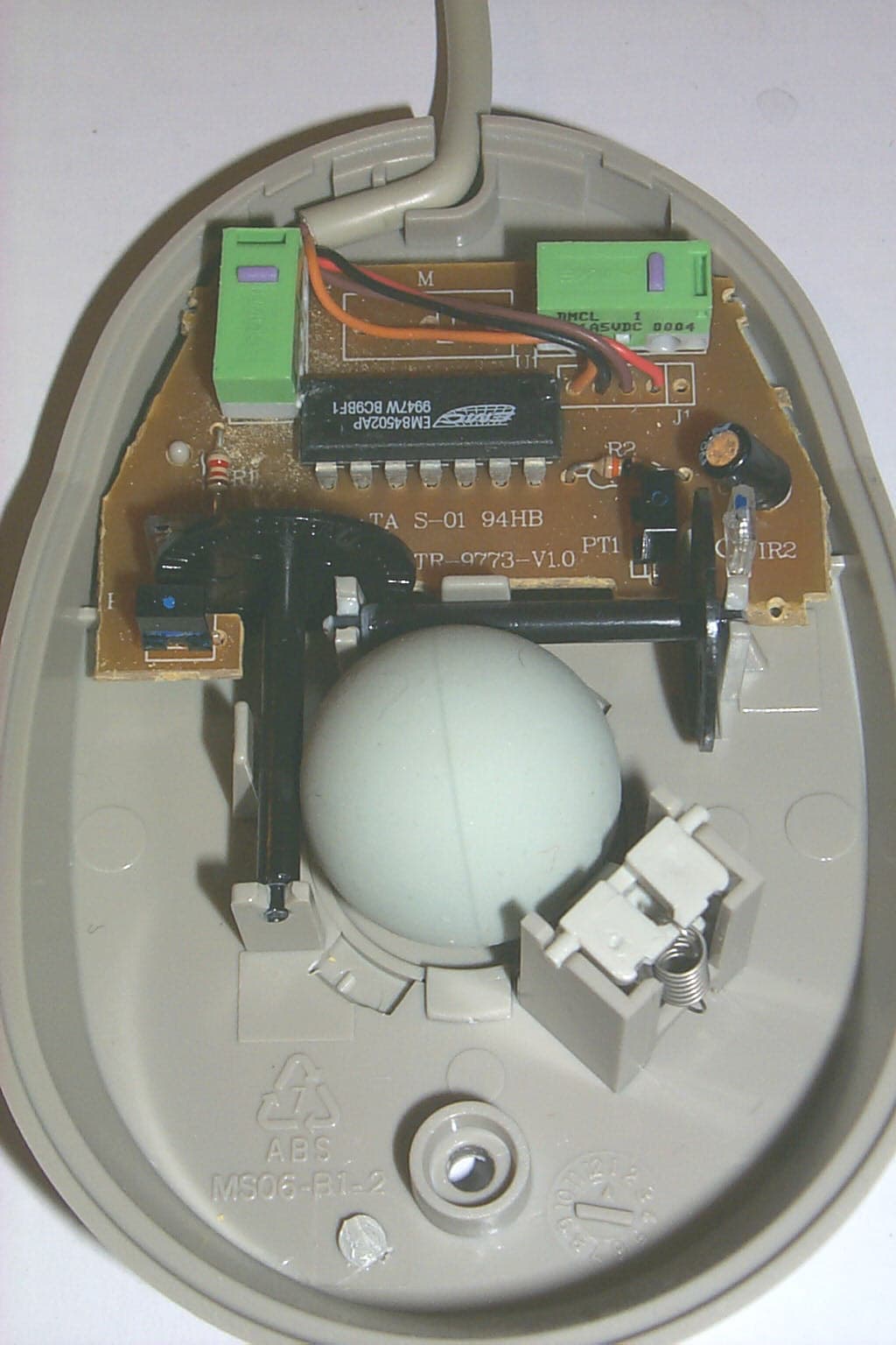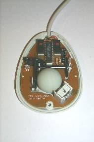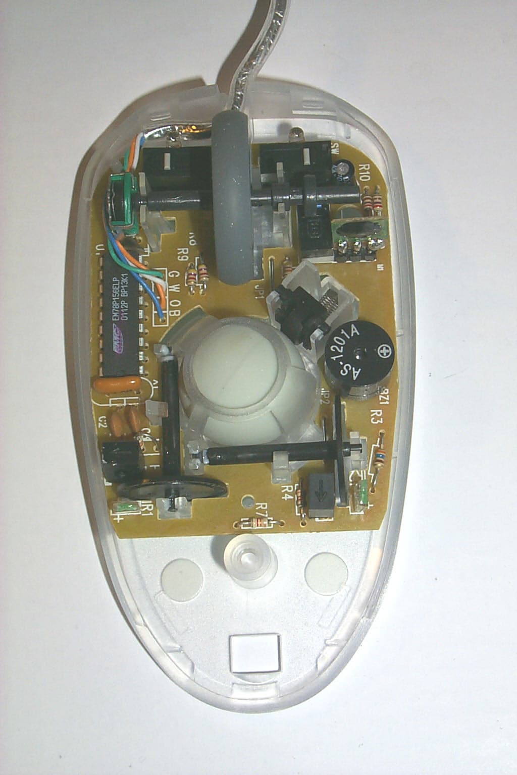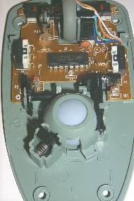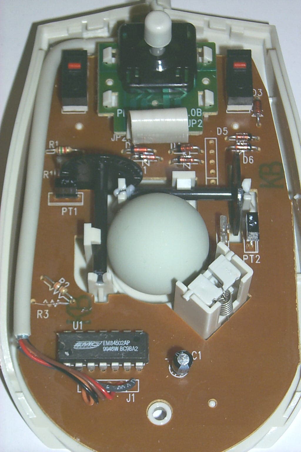 Крепится нижняя часть корпуса на одном винте. Внутри — плата, на которой расположены два микропереключателя LH-98, чип EMC EM84502AP и пять проводов интерфейсного кабеля, запаянных на плату без разъема. Стик располагается в головной части мышки на отдельной плате, крепящейся к основной посредством четырех защелок и соединяющейся с ней посредством пяти-проводного шлейфа.