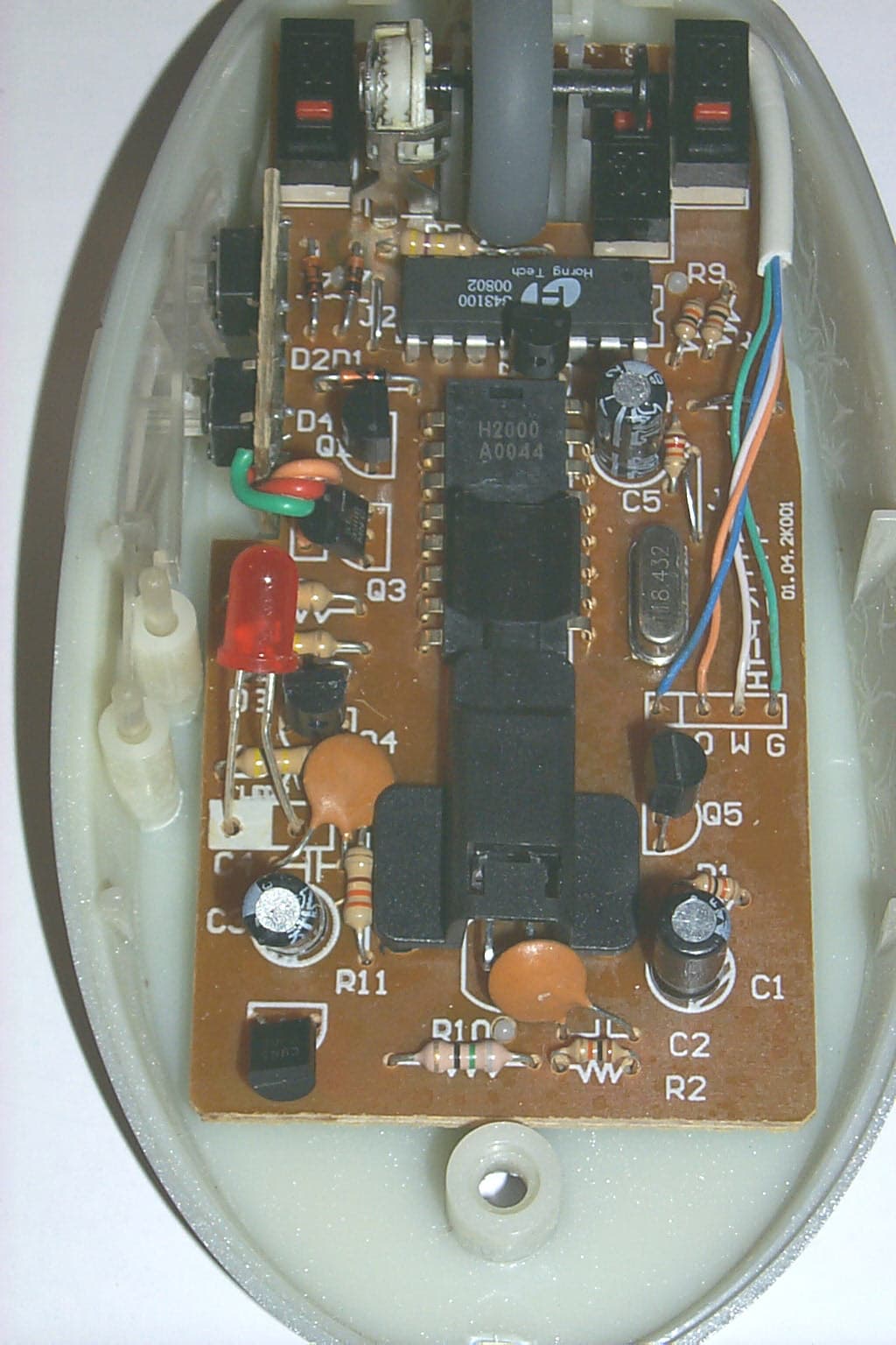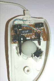 Теперь обратимся к внутренней части мышки. Открутив один винт и сняв крышку, можно обнаружить три микропереключателя DM1, но не от IC, обслуживающие две основные кнопки и колесо прокрутки, и чип фирмы Horng Tech 343100. Два других микропереключателя, обеспечивающие работу дополнительных кнопок, располагаются на отдельной вертикально стоящей плате. Четыре провода из интерфейсного кабеля тоже впаяны в основную плату.