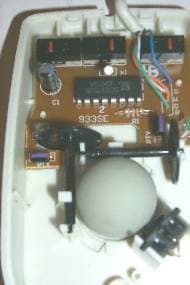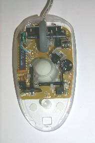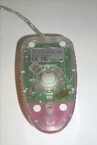 Чтобы увидеть внутренность мышки, не требуется ее разбирать, поскольку она вся прозрачная, но для лучшего рассмотрения мы это сделаем, открутив все тот же один единственный винт и сняв крышку. На плате мы видим три микропереключателя. Два из них, обслуживающие основные кнопки, от ZIPPY, третий, обслуживающий колесо, от IC. Сердцем мыши является чип EMC EM78P156ELP. Четыре провода от интерфейсного кабеля запаяны на плату без разъема. Шарик слегка прикрыт защитным куполом. Колесо в данной модели механическое , что снижает срок его жизни. На правой стороне платы посередине стоит спикер, из которого доносится оповещающая мелодия, а перед двумя основными микропереключателями находятся два светодиода, которые мигают ярко-красным светом (для чего все это нужно, читайте далее). Помимо сменных корпусов, в комплекте к мышке идет инструкция на английском языке и дискета с драйверами для Windows 95, Windows 98, Windows NT, Windows 2000.