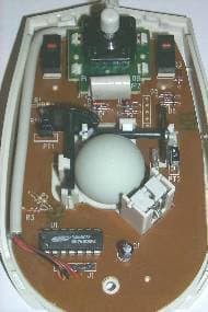 Внутри мыши нас ожидает целый набор микропереключателей: три из них неопределенной фирмы обслуживают две основных и среднюю кнопки, а два других от Solteam обслуживают дополнительные боковые кнопки. Основой электрической схемы мыши является чип HT82M398A. Шарик практически полностью закрыт защитным куполом, что позволяет дольше хранить его в чистоте. Колесо выполнено из нескользкой резины и имеет самую высокую степень дискретности из всех трех мышиных колес данного обзора. Но оно, так же, как и у предыдущей мышки, имеет механическую систему слежения за его вращением.