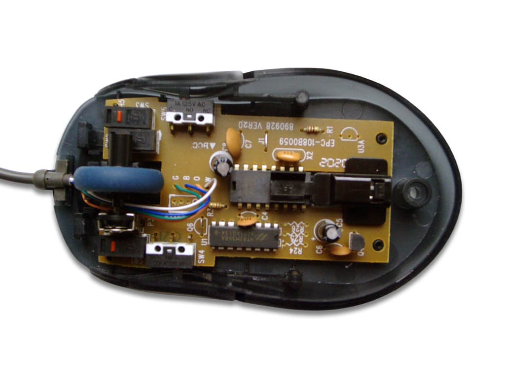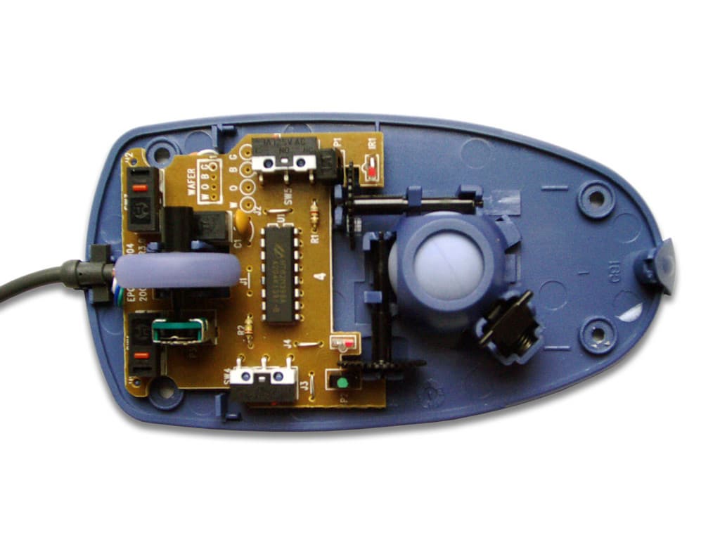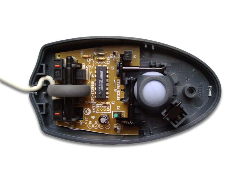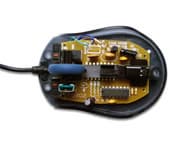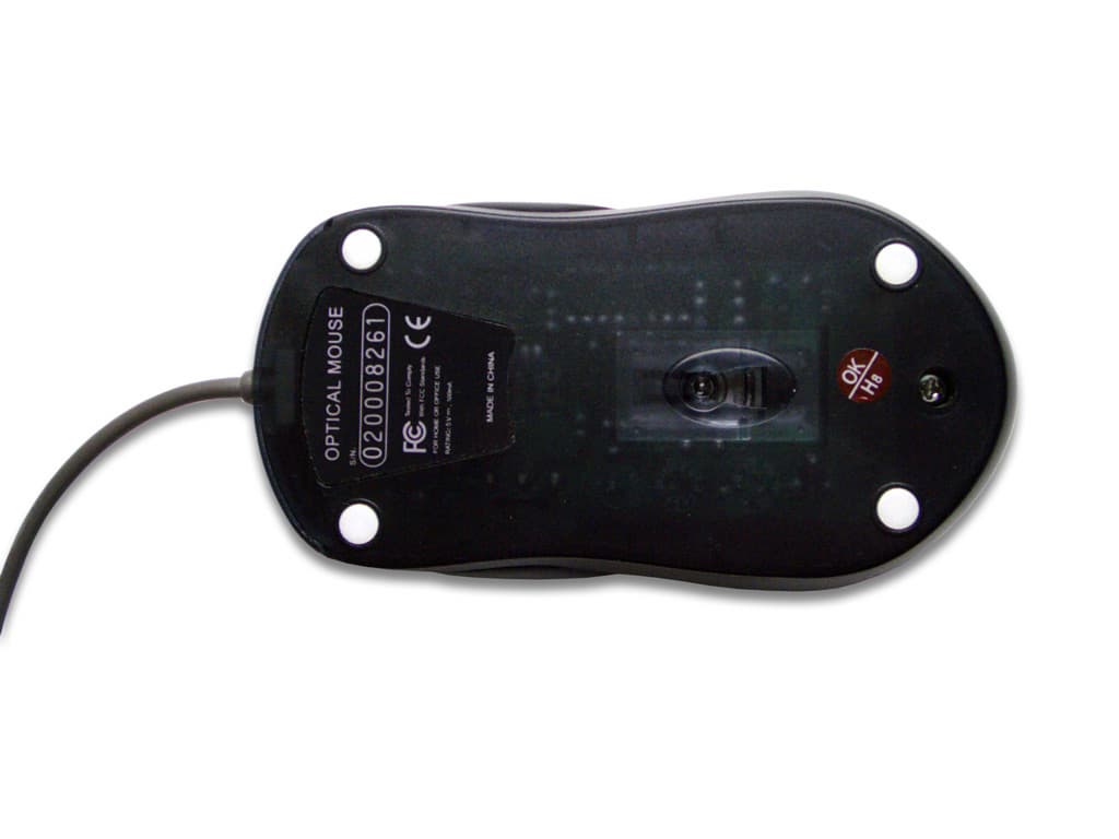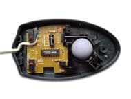 В общем-то, пользователю нечем интересоваться внутри корпуса этой мыши. Обычная оптико-механическая система, недорогие микропереключатели китайского производства, некоторое количество пассивных элементов электрической схемы и чип от EMC — вот все, что можно обнаружить на печатной плате. Хотя, кроме этого, на ней присутствуют размеченные места установки разъемов интерфейсного кабеля. Сами разъемы скупой китайский производитель, конечно же, не установил. На этом он, учитывая массовость производства мышек, сберег для себя изрядную сумму.