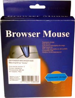 Разрешающая способность Defender Browser 830, заявленная производителем, составляет 400 DPI. Интерфейсный кабель, заканчивающийся разъемом PS/2, имеет серо-серебристый окрас и неплохо сочетается с дизайном корпуса мыши. Он несколько длиннее, чем у двух моделей от Defender, описанных выше, его длина составляет 1.42м. Судя по информации, нанесенной на коробку, данная модель не ограничена интерфейсом PS/2 и выпускается, так же, с USB, PS combo, и UP combo вариантами подключения.