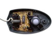 Внутренности мыши выглядят соответственно ее внешнему виду, то есть достаточно дешево. И без того небольшая печатная плата практически пуста. На ней размещены чип EMC, два недорогих микропереключателя, две оптико-электрических пары, входящих в состав оптико-механической системы мыши, два резистора и одна емкость. Тратиться на разъем для интерфейсного кабеля производитель не стал, так что четыре проводника этого кабеля припаяны непосредственно к контактным площадкам на печатной плате.