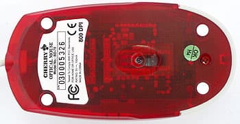 На виде снизу превосходно заметна надпись на наклейке, гласящая о том, что разрешение мыши действительно составляет 800 dpi. Вообще, когда меня в чем-то начинают так активно убеждать, я начинаю сомневаться :) Сквозь полупрозрачную пластмассу красного цвета хорошо видна «начинка» грызуна.![]()