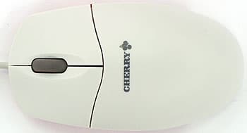 Осмотр сверху ничего нового нам принести не способен: обычная трехкнопочная мышь со скроллером. Колесико прокрутки без изысков: серая гладкая резина. Никакой вам подсветки изнутри или рифленой поверхности — оставьте это для более дорогих моделей. Скромный серый логотипчик (это на клавиатурах он смотрится гордо, а в мышах Cherry пока еще заметного следа не оставила) на спинке.