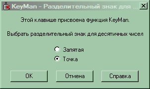 Новый смысл обрела и клавиша «точка» на дополнительной цифровой клавиатуре. Теперь она может вводить не только точку, но и запятую (настраивается при первом же нажатии; позднее установку можно изменить). Зачем? Цифровая клавиатура нередко используется для ввода чисел, так что наличие точки в этой группе полезно, но только для англоязычных стран — во многих (и у нас в частности) стандартным разделителем является запятая. Так что получалась некоторая дискриминация: одним все удобства, а другим разделитель искать в другой части клавиатуры. Теперь же данное недоразумение устранено. Кстати — нажатие этой кнопки совместно с KeyM@n меняет значение на противоположное: вместо точки — запятая или наоборот.