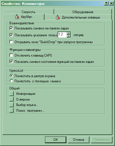 Общие настройки клавиатуры и ПО находятся на закладке «KeyMan». Можно включить или отключить отображение значков в трее, выбрать время нахождения подсказки клавиши на экране или вообще отключить подсказки, включить или отключить появление QuickDrop при запуске программы (о том, что это такое, мы поговорим позже), а также настроить местоположение XPressList — в центре экрана или рядом с курсором мыши. Интересной возможностью является отключение фиксации верхнего регистра: она в наше время нужна крайне редко (можно использовать более красивые способы выделения текста, нежели написание ЗАГЛАВНЫМИ буквами), так что чаще мешает, чем помогает. А еще на этой закладке есть четыре маленьких кнопочки.