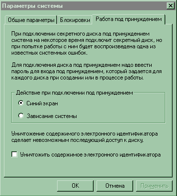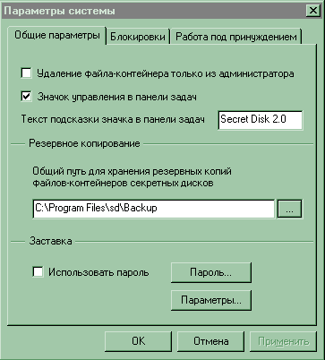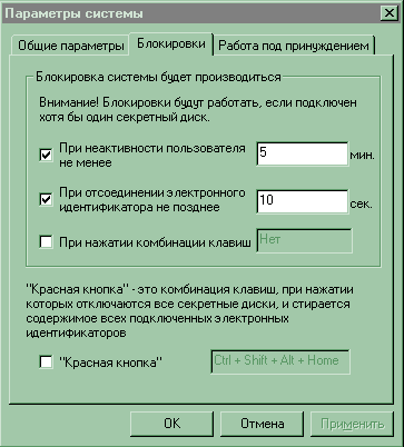 Дополнительные параметры. Полезна возможность автоматической блокировки компьютера если подключен хотя бы один секретный диск (иначе можно легко лишить всю возню смысла, если вы отойдете от компьютера даже на несколько минут). "Красная кнопка" инструмент очень мощный, но иногда необходимый. Если вы будете ее использовать, стоит хорошенько продумать комбинацию клавиш, дабы не потерять все данные просто работая в какой-либо программе. Впрочем, предлагаемое по-умолчанию значение для этой роли вполне подходит.