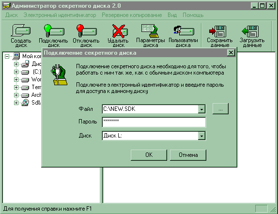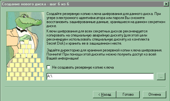 Наличие такого средства несколько ослабляет защиту, так что стоит трижды подумать: нужна это вам или нет. При создании копии ключа в руководстве рекомендуется сразу делать это на дискете (что, по-умолчанию, предложено и в данном диалоге), ибо если создать его на винчестере, а потом удалить, то все же доступ к файлу иногда возможен.