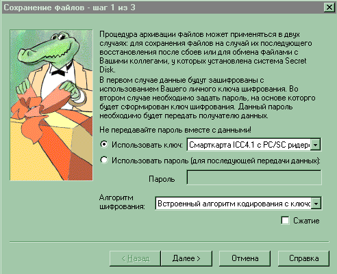 Наряду с "паролем под принуждением", архивация файлов является одной из мощнейших особенностей системы. Особо добавить к содержимому диалогового окна мне нечего — там все хорошо рассказано :) Вообще, хочется похвалить Aladdin за отличную документацию системы, особенно электронную — подробные комментарии каждого шага позволяют работать даже не читая бумажную документацию. Впрочем, последнюю все равно стоит прочесть обязательно — она читается как хорошее художественное произведение.
