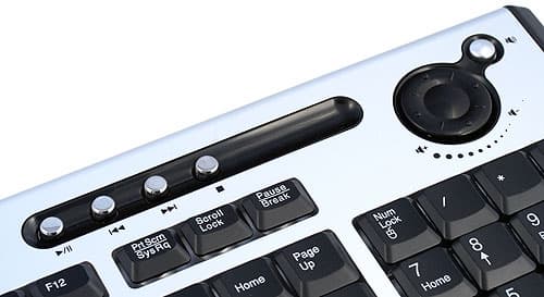 Продолжим знакомство с кнопками. В правой половине клавиатуры на уровне описанных выше 11 кнопок расположены четыре круглые пимпочки, управляющие воспроизведением в плеере. Вот к ним уже особых претензий нет — переопределять желание редко у кого возникает. И в правом углу самое шикарное — вращающийся регулятор громкости и кнопка Mute. В общем, ничего особенного и ранее невиданного нет, однако на фоне других мультимедийных клавиатур той же ценовой группы краснеть производителю точно не придется. С другой стороны, и похвастаться на общем фоне нечем.
